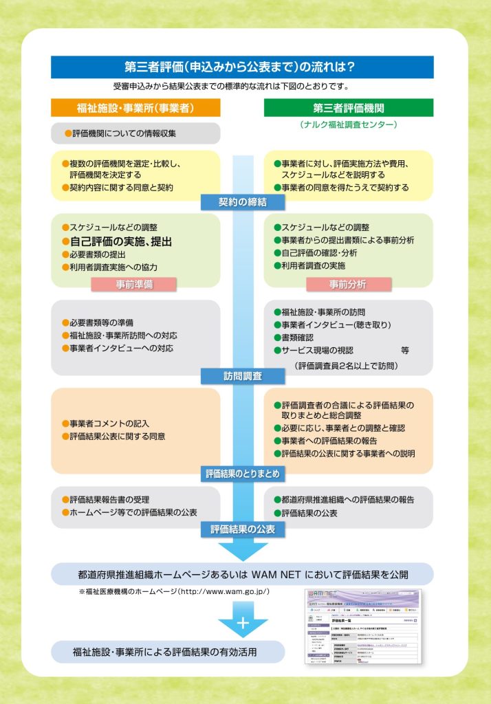 大阪と神奈川のナルク福祉調査センターでは、全国共通の評価基準に基づきサービスの品質の評価を行い、評価結果を公表することで、サービスの改善につなげ入所者の福祉の向上に寄与することを目的としています。