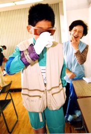 平成15年2月3日 箕面市箕面第4中学校の1年生30人が午後2時間を高齢者疑似体験「うらしま」を勉強体験し、高齢者への思いやりを一層深くしました。この行事はナルク豊中・池田・箕面拠点の20人がサポートしました。