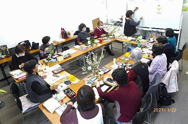 ほんわか穏やかな山本典子会員の指導で、墨や顔彩だけでなく、シグマペンやクレヨン、折り紙なども使って表現しています。