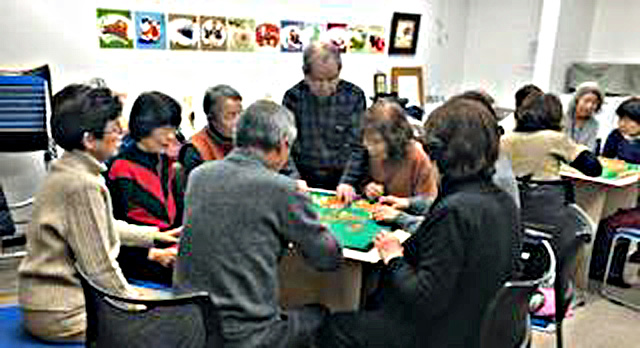 昨年11月に発足した「健康マージャン」同好会に毎回15~16人のメンバーが「ふれあいルーム」でゲームを楽しんでいます。