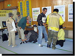そして、去年に引き続き高齢者擬似体験コーナー「うらしま太郎」を併設した。 「うらしま太郎 」を体験してみると、階段の上り下りは不自由、お茶を飲むのも不自由、ペットボトルのキャップは取りにくいなど、お年寄りの動作緩慢なのが良く分かる。