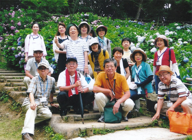 弁当やお菓子を配り、さっそく、美しく咲き誇った紫陽花を観賞し、少し遅くなった花菖蒲園をお喋りしながら散策をしました。