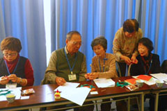 地区の植本さんより、折り紙講師の北村貞子先生の紹介があり、「季節の折り紙」を教えていただきました。 最初にクリスマスのリース飾り枠を、そしてローソク、サンタクロースを折り、次に吹きゴマを作りました。