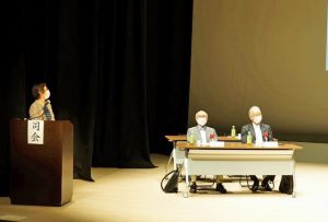 定時総会で司会をする筆者 左端