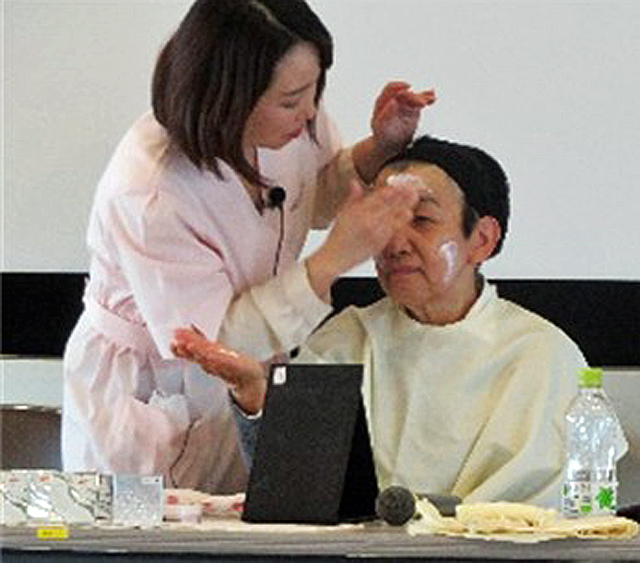 今回は表題のメイクを取り上げました。化粧品メーカーの方を講師に迎えてマッサージの方法、肌の色に合うファンデーションの選び方、効果的なメイクのポイントを教えていただきました。