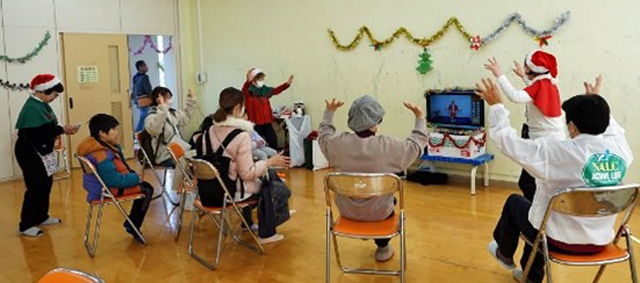 クリスマス歌体操は52名の参加があり、ビデオを見ながらサンタクロースの恰好をした会員が椅子に座って体操を踊り、ちびっ子たちも、見よう見まねで嬉しそうに踊ってていました。