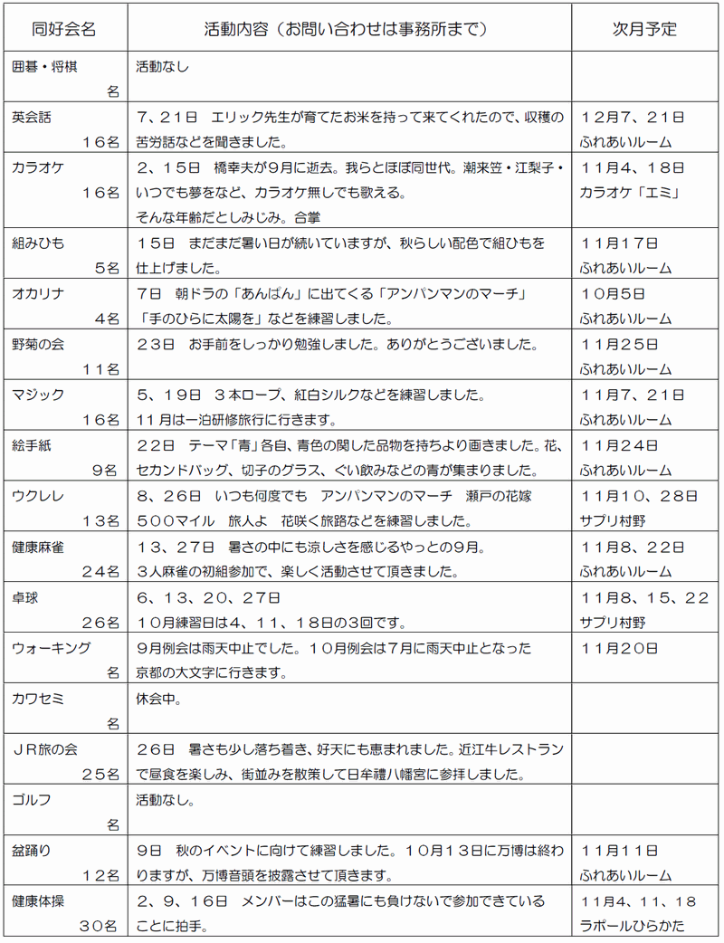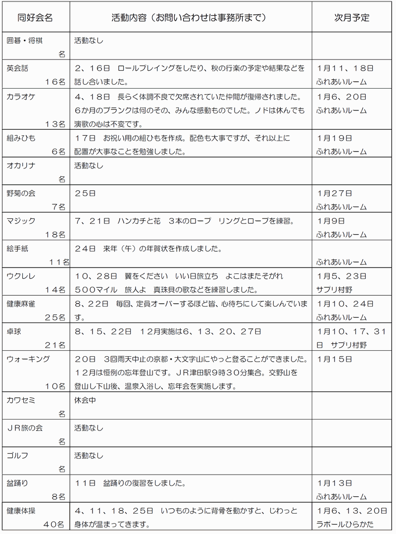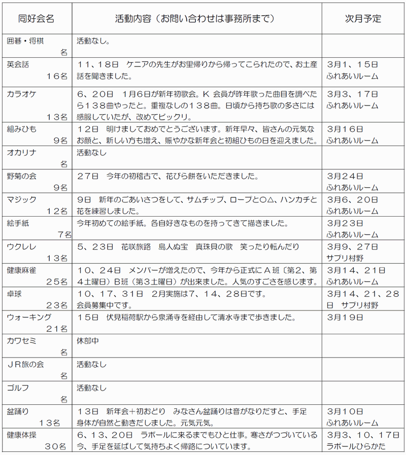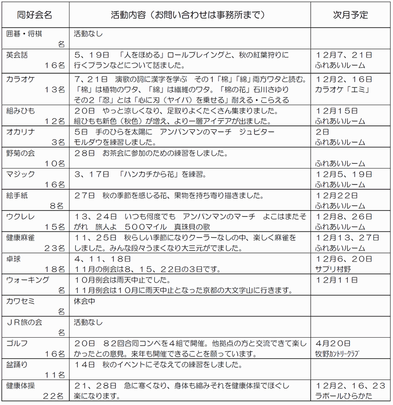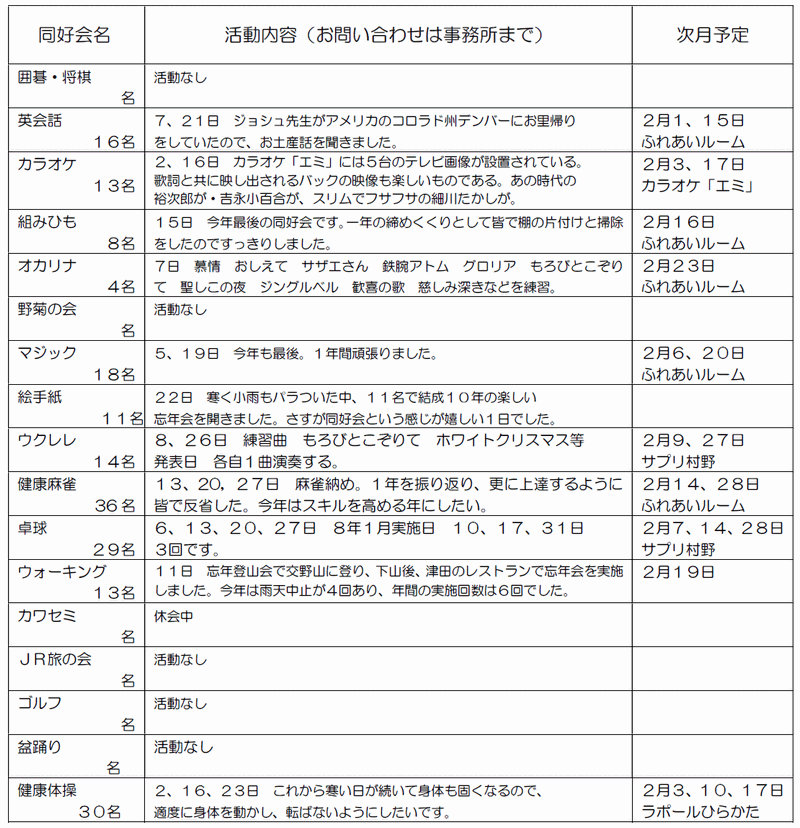 ※「行事予定」及び「同好会活動の予定」は、下記にそれぞれの2ヶ月分を掲載しています。 クリックで全画面表示します。